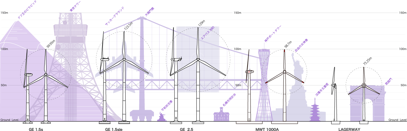 50kwの風車の直径は15mでしたので、ここ30年前後で飛躍的に大型化したと言えます。